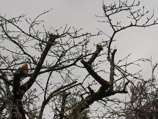 Teil-Einkürzungen von überhängenden Kronenteilen können relativ schadensfrei und schonend an geeigneten Saftziehern durchgeführt werden, wenn auch nicht stur an der Grundstücksgrenze.