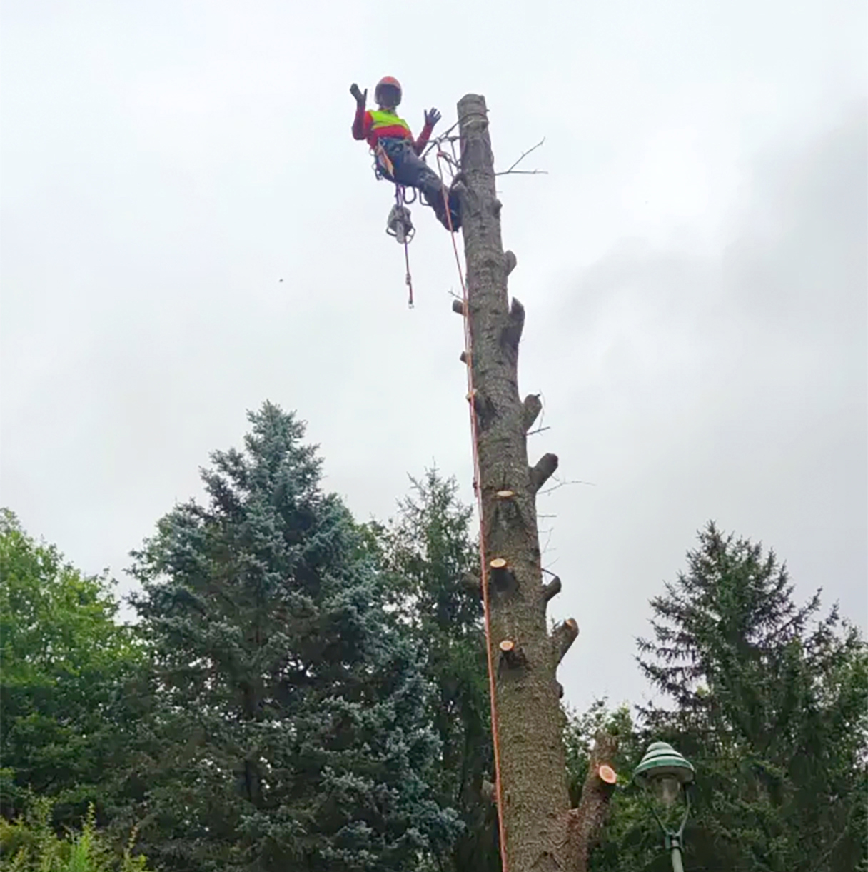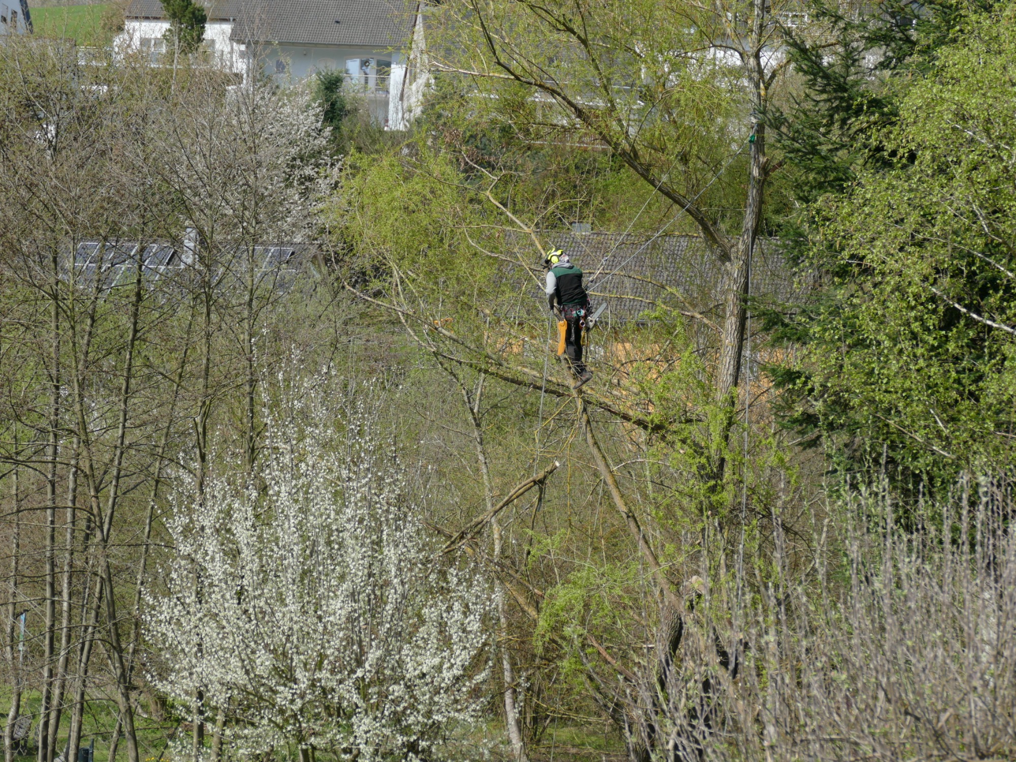 In den vielen Fällen ist im Siedlungsumfeld kein freies Fällen ohne Gefahr oder Zerstörungen möglich. Wir setzen dann Verfahren zum behutsamen Absetzen von Teilen des Astwerks und des Stamms ein, bei dem wir uns Zugang mit Seilklettertechnik oder Arbeitsbühnen verschaffen. In besonders beengten Verhältnissen, oder wenn die Flächen unter dem Baum besonders geschützt werden müssen, seilen wir auch jedes Teil einzeln ab bzw. oder stellen Seilbahnen auf, um die Baumteile seitlich aus der Gefahrenzone zu transportieren. In Einzelfällen müssen auch Kräne eingesetzt werden.